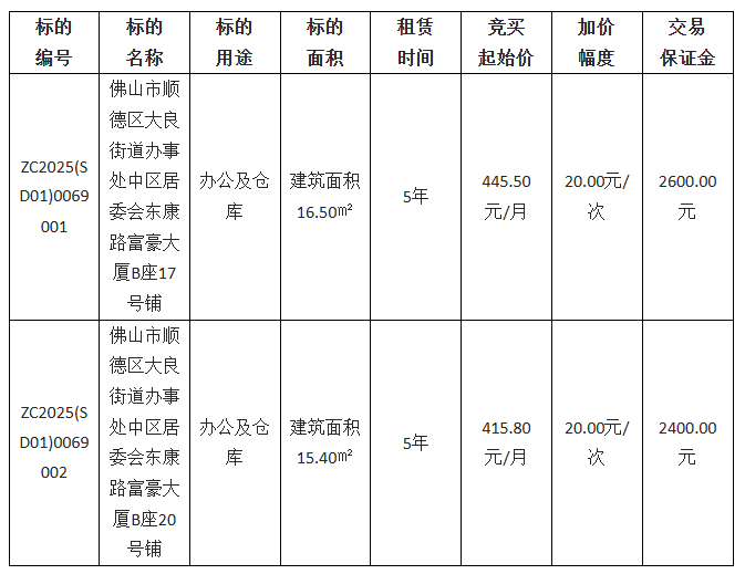 佛山市顺德区景良投资发展有限公司采用网上竞价方式出租位于佛山市顺德区大良街道办事处中区居委会东康路富豪大厦B座17号铺等2宗物业,欢迎符合资格的竞买人参与竞价。