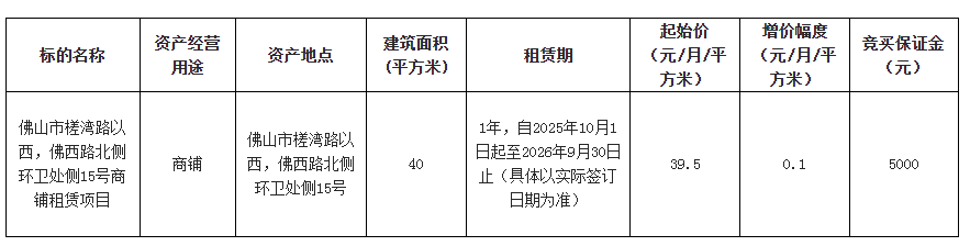 6.免租期:给予装修免租期1个月,自2025年10月1日起至2025年10月31日止(具体以实际签订日期为准),免租期间免收竞得人的租金。