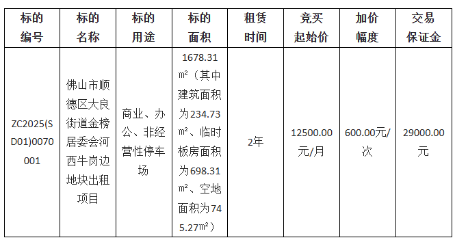 佛山市顺德区盈良物业管理有限公司采用网上竞价方式出租位于佛山市顺德区大良街道金榜居委会河西牛岗边地块,欢迎符合资格的竞买人参与竞价。