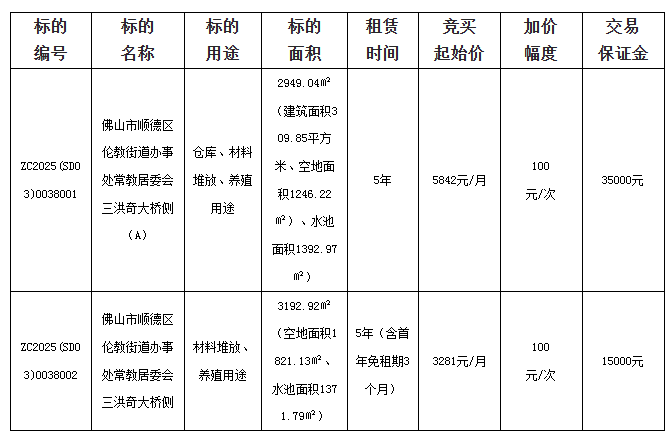 1.本项目的交易保证金为:(1)佛山市顺德区伦教街道办事处常教居委会三洪奇大桥侧(A)人民币大写叁万伍仟元整(小写:¥ 35000);(2)佛山市顺德区伦教街道办事处常教居委会三洪奇大桥侧人民币大写壹万伍仟元整(小写:¥ 15000)
