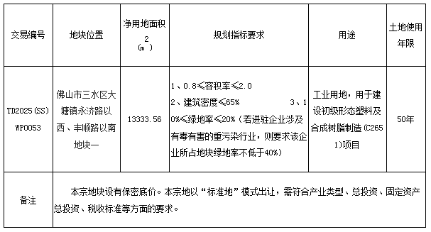 五、有意参与竞买者可于2025年9月19日后登录网上交易系统下载TD2025(SS)WP0053地块的《佛山市三水区国有建设用地使用权网上拍卖出让文件》。