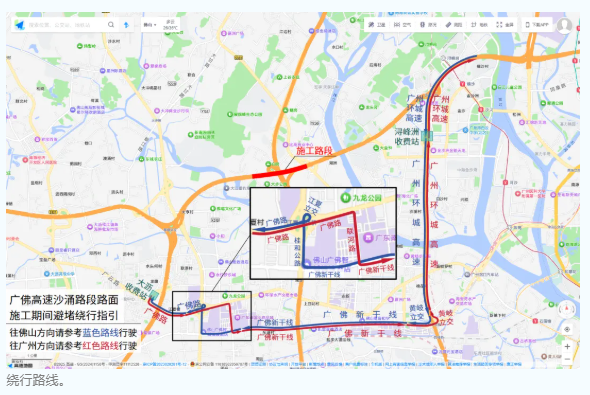 如从该路段前往佛山,建议提前在广州环城高速绕行至佛山黄岐立交、广佛新干线、桂和路、广佛路,再经广佛高速大沥站返回高速。