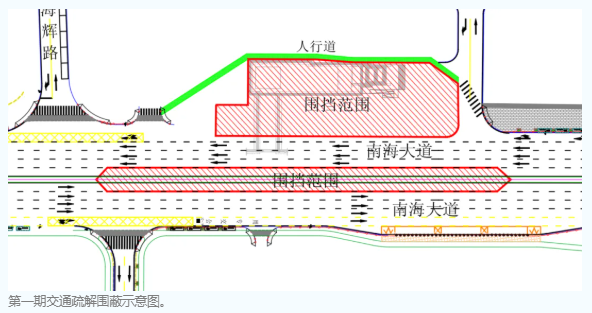 南海大道西侧原人行道由围挡东侧调整到围挡西侧。