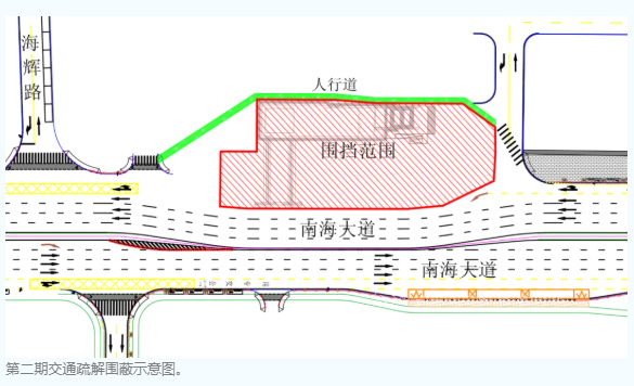 南海大道(劳动广场路段):占用绿化带作为车行道,将围挡东扩两个车道,同时将西侧车行道向东平移两个车道,围蔽后南海大道(劳动广场路段)由现状东侧5车道、西侧4车道调整为东侧4车道,西侧4车道。