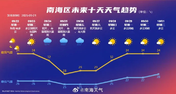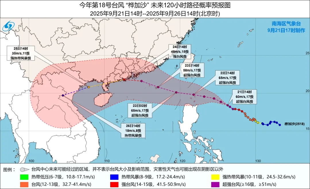 南海区气象台预计,9月21日发布台风白色预警信号,9月22日白天发布台风蓝色预警信号,9月23日升级为台风黄色预警信号,后续较大可能升级为台风橙色或以上级别预警信号。