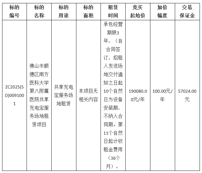 1.项目名称:佛山市顺德区南方医科大学第八附属医院共享充电宝服务场地租赁项目