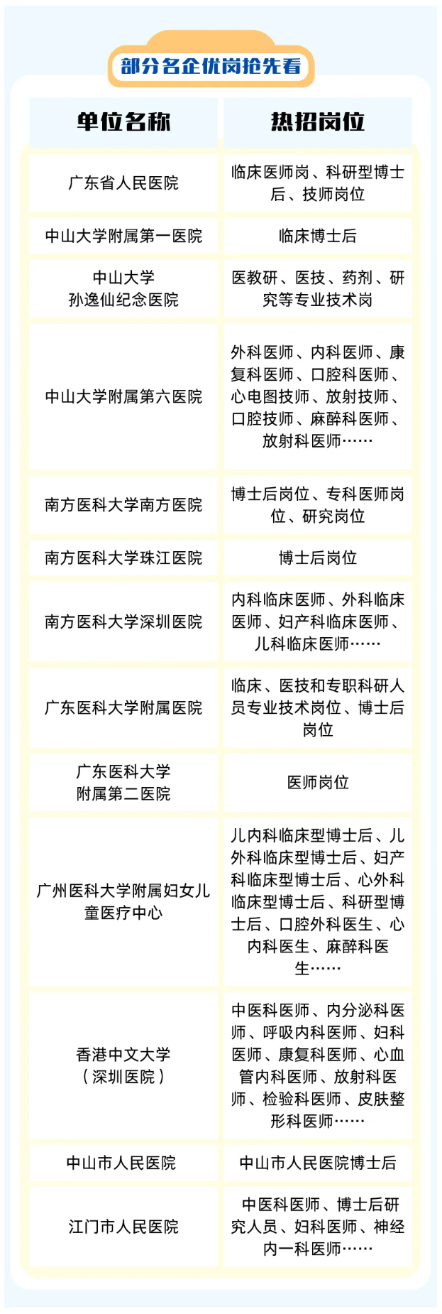 无论是向往国际化的广州、深圳,还是选择宜居宜业的佛山、东莞、中山,均有优质三甲医院释放岗位。