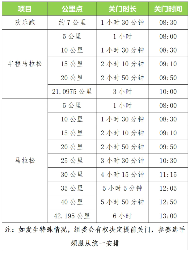 为保证参赛运动员比赛安全和城市道路交通秩序,比赛路线各段专设了赛事关门时间,到达关门时间,相应公里点的计时地毯停止工作,相应路段赛道将解除交通管制并恢复道路正常交通。在规定关门时间内,未跑完对应距离的参赛运动员应立即停止比赛并退出赛道。退出比赛的参赛运动员可搭乘组委会提供的援助车或自行选乘公共交通抵达比赛的终点。否则,由此引发的一切事故将由该运动员自行承担相应法律责任和赔偿责任。