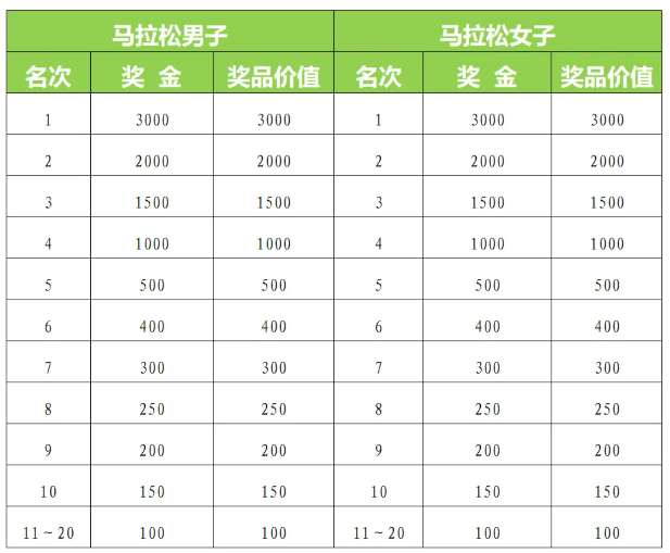 马拉松名次奖1-3名按照枪声成绩排名,4-20名次按净计时排名。男、女参赛选手分别获得奖金(币种:人民币,见下表),男、女前三名各颁发奖杯一座、奖牌一枚。
