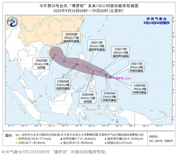 中央气象台预计,“博罗依”将以每小时10~15公里的速度向偏西方向移动,逐渐向菲律宾东部沿海靠近,将于27日进入南海东部海域,之后向西北方向移动,强度有所增强。结合中央气象台9月24日6时发布的“博罗依”路径和强度预报图,“博罗依”存在着9月29日前后,以台风级强度靠近海南、广东等华南沿海地区的可能。
