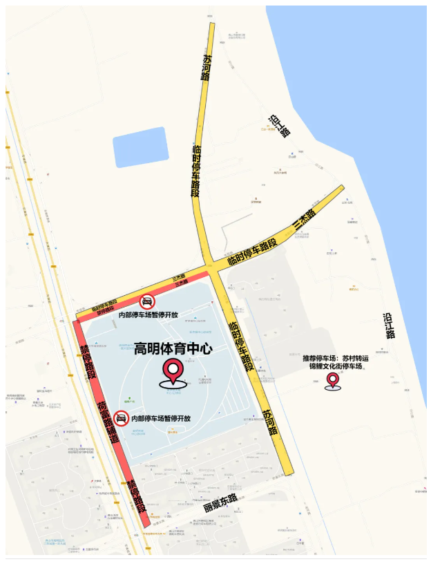 比赛期间(9月26日-27日),高明体育中心内部停车场全面暂停对外开放,禁止任何社会车辆驶入停放,仅保障赛事工作车辆通行与停放需求。