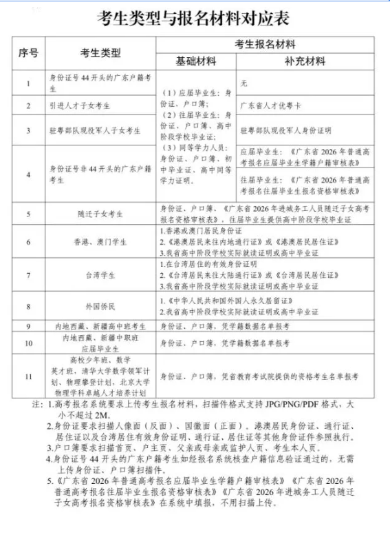 考生类型与报名材料对应表