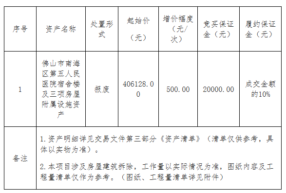 (2)本项目以资产评估价406128元作为项目起始价,每次增价幅度为500元。本项目采用网上竞价,交易系统根据价高者得的原则判断竞价结果,竞买人的最终有效报价不低于起始价的,该报价为最终成交价,该报价者为竞得人,交易成功;否则交易不成功。