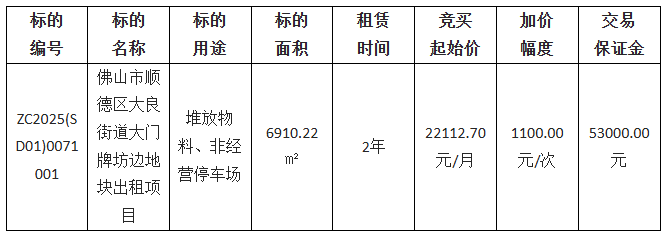 佛山市顺德区大良德良物业管理公司采用网上竞价方式出租位于佛山市顺德区大良街道大门牌坊边地块,欢迎符合资格的竞买人参与竞价。