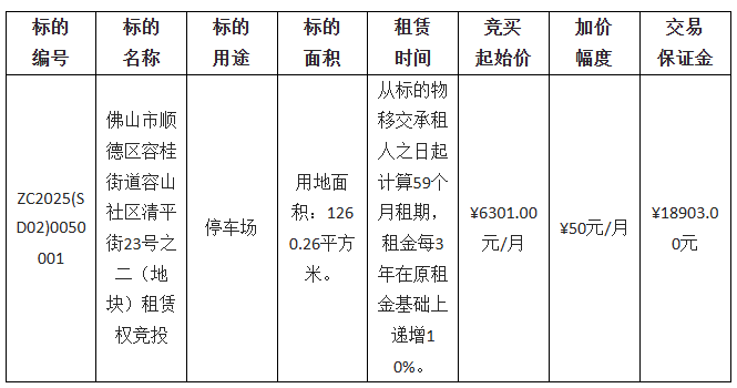 1.项目名称:佛山市顺德区容桂街道容山社区清平街23号之二(地块)租赁权竞投
