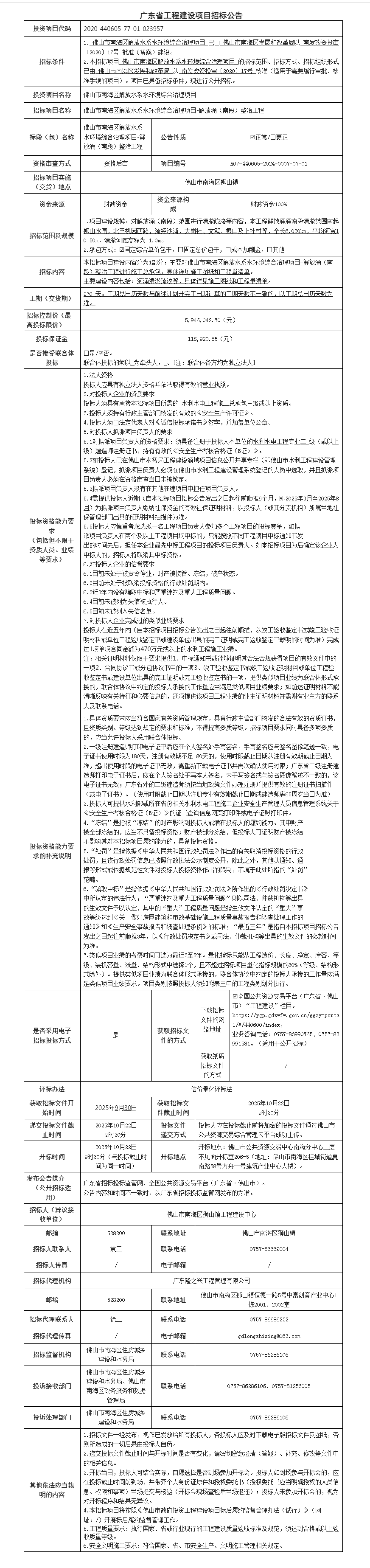 佛山市南海区解放水系水环境综合治理项目-解放涌(南段)整治工程招标公告