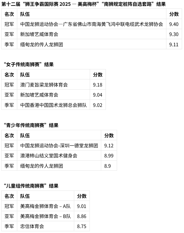 儿童组、青少年组及女子组赛事同样精彩,展现出新生代狮者的无限潜力与创新力量。“儿童组传统南狮赛”由本地狮队包办三甲,分别由美高梅金狮体育会 – A队荣膺幼狮狮王,美高梅金狮体育会 – B队获得亚军以及忠信体育会夺得季军。“女子传统南狮赛”方面,澳门麦旨梁龙狮体育会夺得女狮王殊荣,新加坡艺威体育会及中国香港中国国术龙狮总会狮队分获亚、季军。青少年组竞争尤为激烈,参赛队伍数为历届之最,最终由中国龙狮运动协会 – 深圳一德堂龙狮团夺冠,澳港柿山结义堂国术健身会以及缅甸龙的传人龙狮团分别获得亚军与季军。