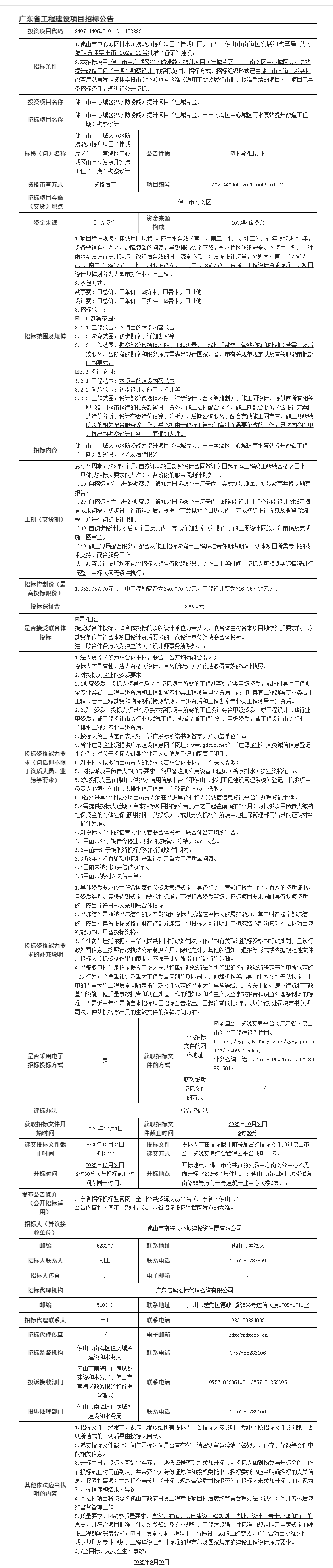 佛山市中心城区排水防涝能力提升项目(桂城片区)——南海区中心城区雨水泵站提升改造工程(一期)勘察设计招标公告