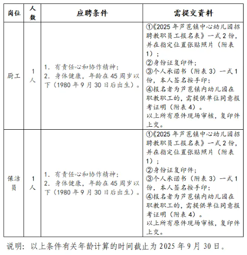 本次招聘厨工1人、保洁员1人,合共2人。录用人员须服从幼儿园统一工作安排,工作地点芦苞镇中心幼儿园龙坡分园(芦苞镇三水大道北427号江畔明珠花园之2号)。