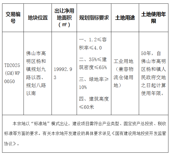 本块地其他规划建设要求按《高明区土地使用规划条件》(佛规明设函〔2025〕0095号)执行。