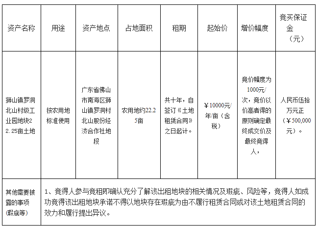 2.佛山市公共资源交易中心南海分中心通过佛山市资产交易网上交易系统及粤公平网站发布的项目信息(包括但不限于公告信息、交易文件、合同条款等)并不构成佛山市公共资源交易中心南海分中心对项目的任何交易建议。意向竞买人应不依赖于已披露的项目信息并自行对项目的相关情况进行必要的尽职调查和充分了解,对是否竞买该项目及项目成交后可能发生的费用和存在的风险自行作出充分评估,并独立承担所有风险。意向竞买人一经申请参加竞买,即视为知晓、认可项目现状,佛山市公共资源交易中心南海分中心对此不承担任何法律责任。