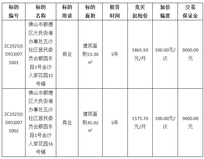 1.项目名称:佛山市顺德区大良街道办事处五沙社区居民委员会顺园东路1号金沙人家花园15号铺等2宗物业出租项目