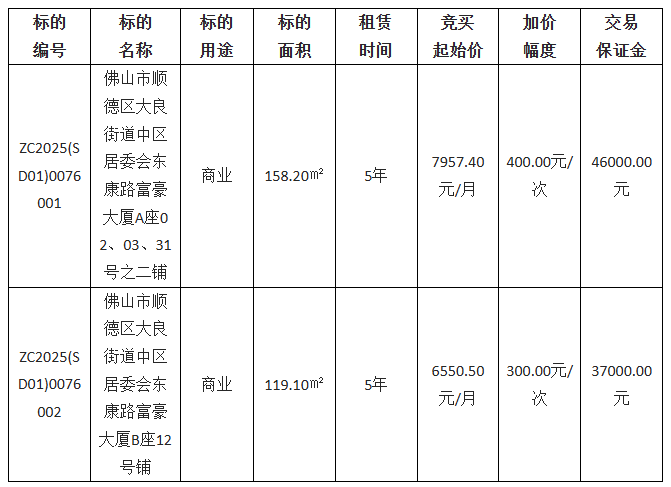 1.项目名称:佛山市顺德区大良街道中区居委会东康路富豪大厦A座02、03、31号之二铺等2宗物业出租项目