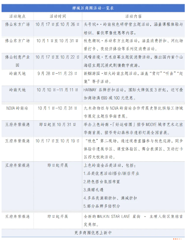 结合秋色巡游活动,禅城区升级消费配套福利,联动核心商圈与餐饮商户推出专属折扣,岭南新天地、东方广场、王府井紫薇港、创意产业园等商圈综合让利超700万元,覆盖餐饮、零售全业态。