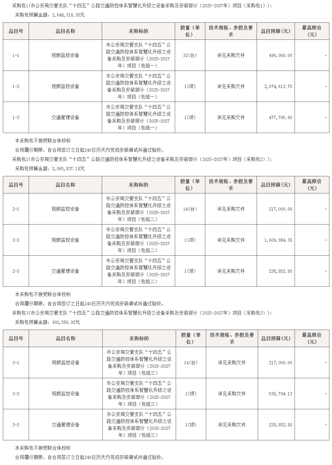 项目名称:市公安局交管支队“十四五”公路交通防控体系智慧化升级之设备采购及安装部分(2025-2027年)项目