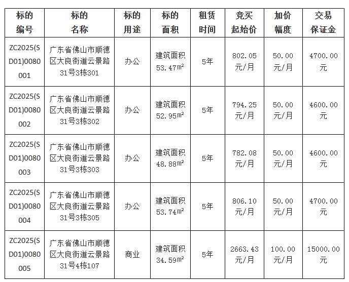 佛山市顺德区大良德良物业管理公司采用网上竞价方式出租位于佛山市顺德区大良街道云景路31号3栋301等5宗物业,欢迎符合资格的竞买人参与竞价。