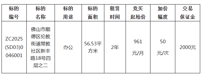佛山市顺德区粮食局伦教粮食管理所采用网上竞价方式出租位于佛山市顺德区伦教街道常教社区新丰路18号四层之二公有物业使用权,欢迎符合资格的竞买人参与竞价。