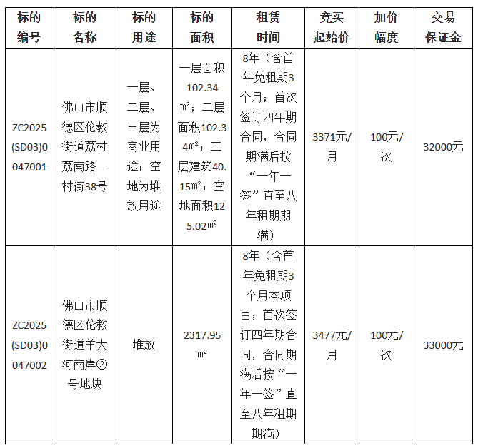 1.项目名称:佛山市顺德区伦教街道荔村荔南路一村街38号等两宗地块公开招租项目