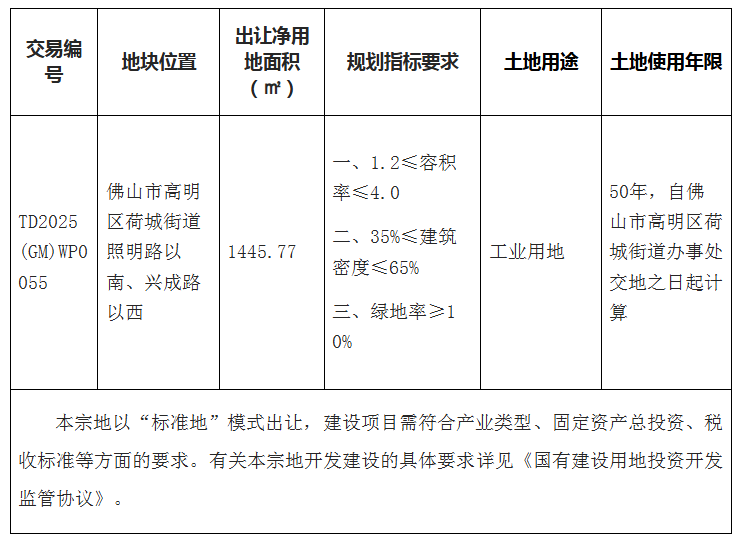 本块地其他规划建设要求按《高明区土地使用规划条件》(佛规明设函〔2025〕0099号)执行。