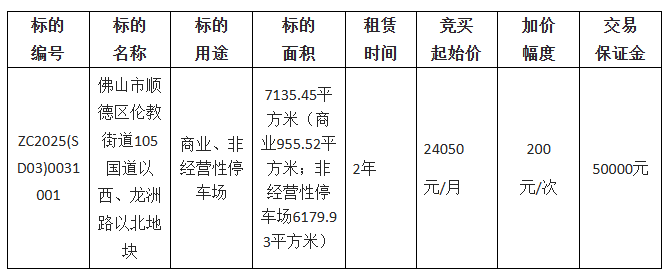佛山市顺德区伦安安防技术有限公司采用网上竞价方式出租位于佛山市顺德区伦教街道105国道以西、龙洲路以北地块使用权,欢迎符合资格的竞买人参与竞价。