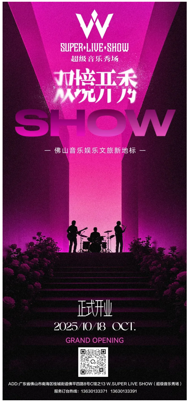 10月18日,W.超级音乐秀场在南海桂城映月湖商圈华南汽车直播基地正式开业,标志着佛山首个“音乐+表演+艺术+科技”为核心的多维感官秀场落地南海桂城,为南海音乐娱乐文旅产业发展注入新动能。