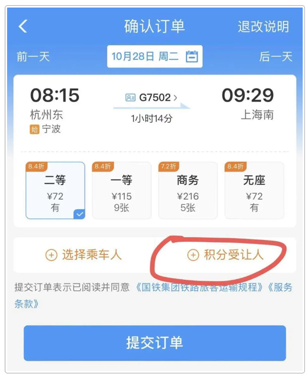 选择心仪的车次,点击预订后,点击“积分受让人”,按要求填写好身份信息,提交订单后用积分支付即可。
