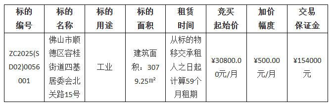 出租方采用网上竞价方式出租位于佛山市顺德区容桂街道四基居委会北关路15号租赁权竞投,欢迎符合资格的竞买人参与竞价。