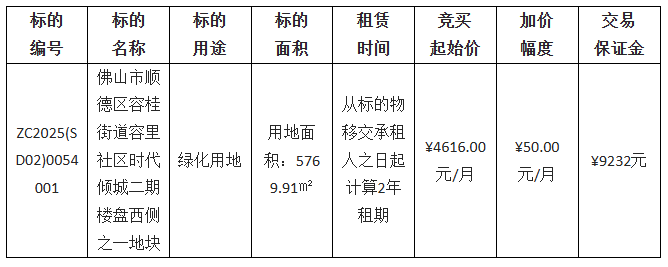 出租方采用网上竞价方式出租位于佛山市顺德区容桂街道容里社区时代倾城二期楼盘西侧之一地块租赁权竞投,欢迎符合资格的竞买人参与竞价。