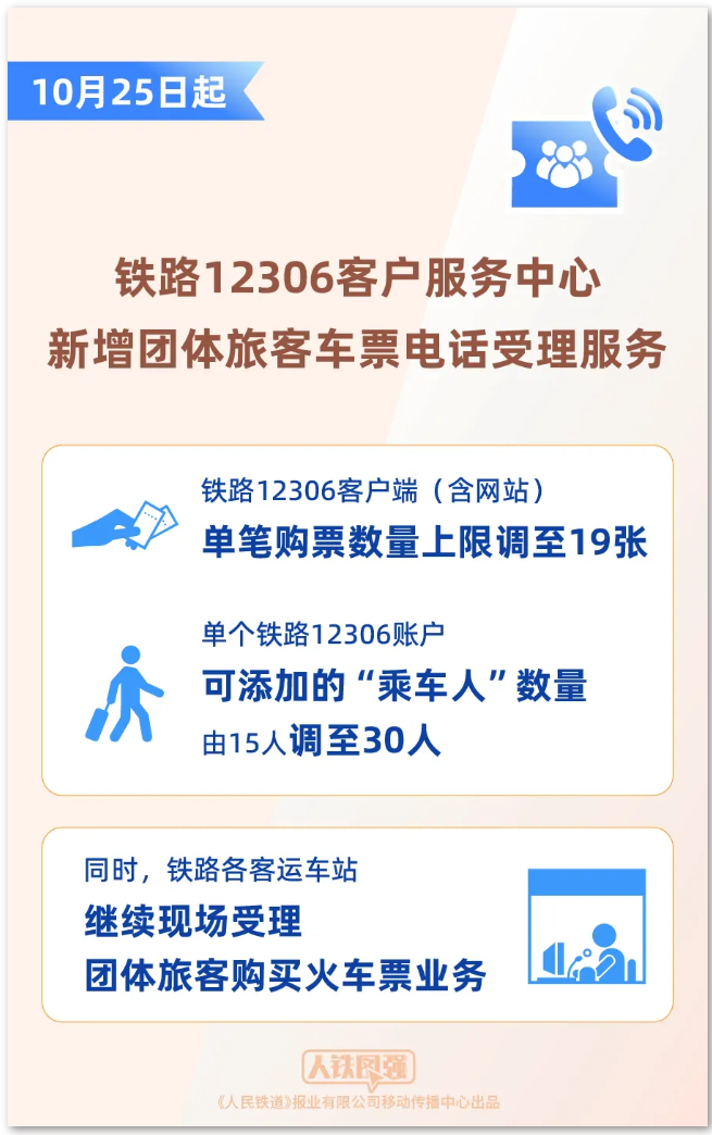 10月25日起,铁路12306客户服务中心(以下简称“12306客服中心”)新增团体旅客车票(以下简称“团体票”)电话受理服务,铁路12306客户端(含网站)单笔购票数量上限调至19张,单个铁路12306账户可添加的“乘车人”数量由15人调至30人,同时,铁路各客运车站继续现场受理团体旅客购买火车票业务,各类旅游、研学、演出、赛事等团体旅客集中购票出行更加方便。