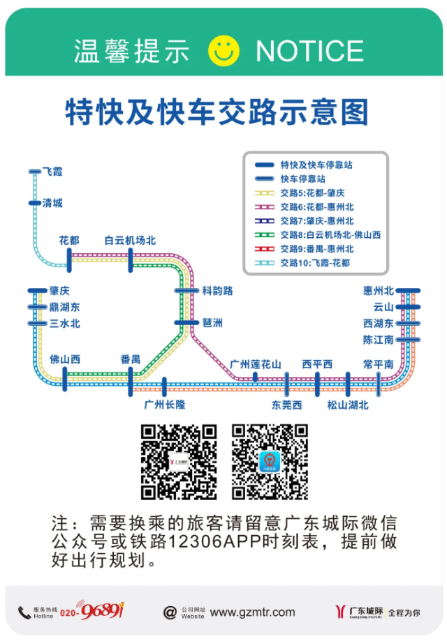 广东城际温馨提醒,运行图调整后,列车开行时间将相应有所调整,旅客可通过“广东城际”微信公众号、12306等提前了解列车发车时间,预留充足换乘时间,以免耽误行程。