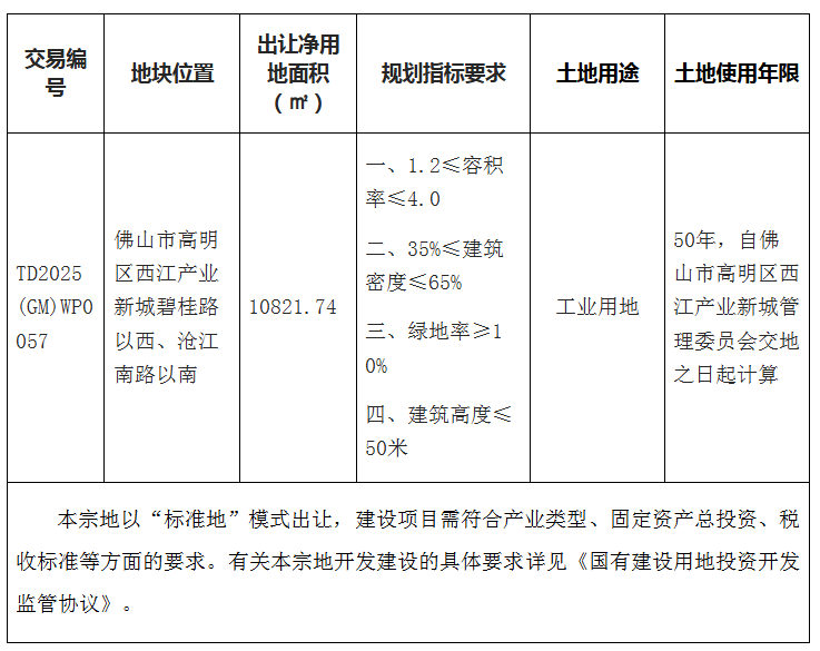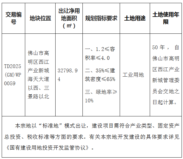 本块地其他规划建设要求按《高明区土地使用规划条件》(佛规明设函〔2025〕0107号)执行。