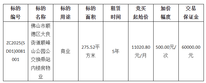 佛山市顺德区宏良建设发展有限公司采用网上竞价方式出租位于佛山市顺德区大良街道顺峰山公园公交换乘站内楼房物业,欢迎符合资格的竞买人参与竞价。