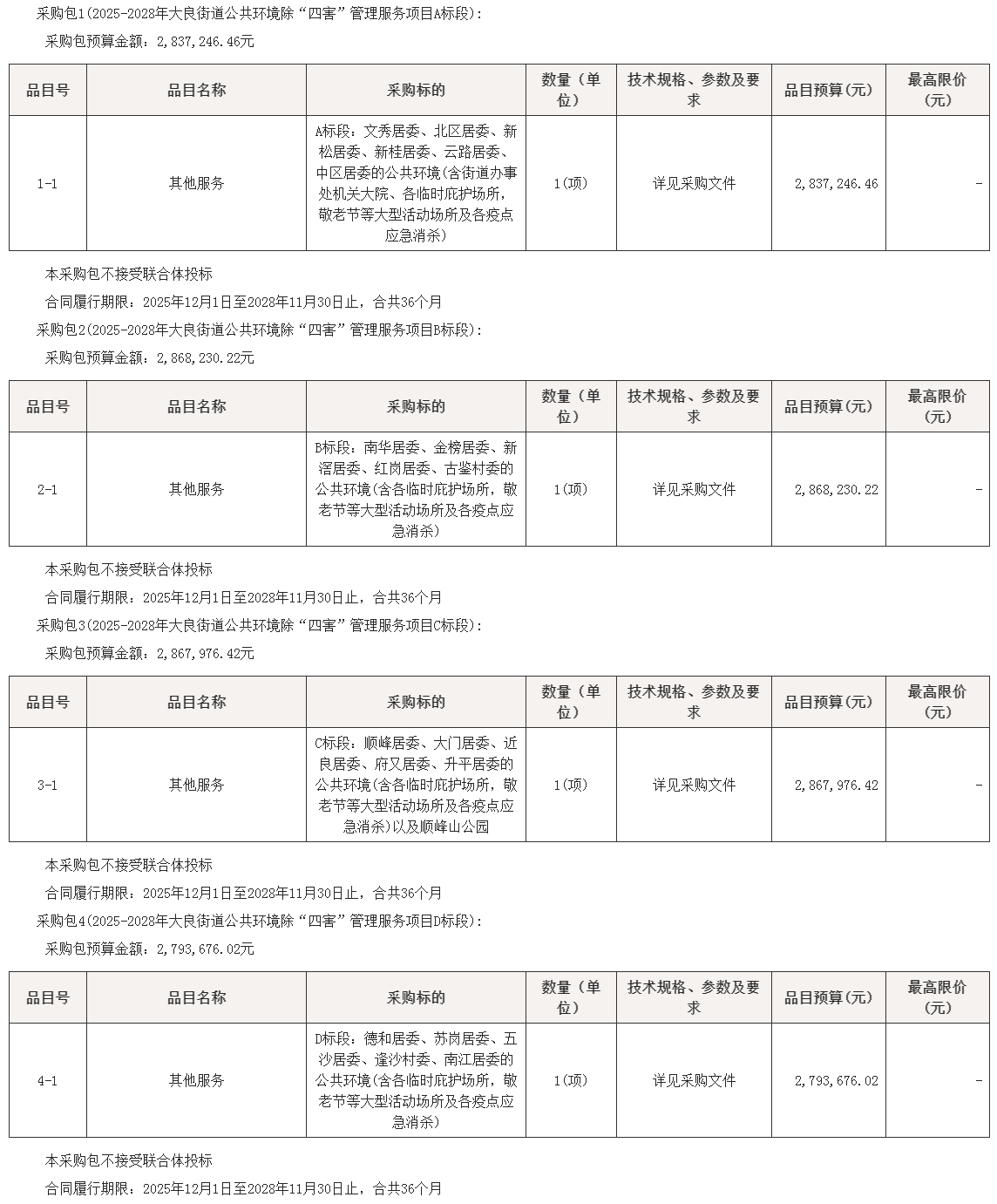 项目名称:2025-2028年大良街道公共环境除“四害”管理服务项目