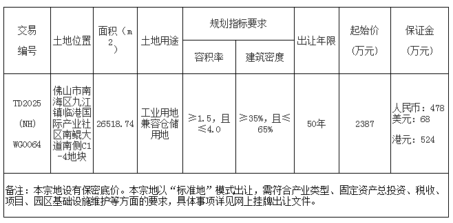 经佛山市人民政府批准,佛山市自然资源局决定委托佛山市公共资源交易中心南海分中心采用网上挂牌方式出让下列地块的国有建设用地使用权。现将有关事项公告如下: