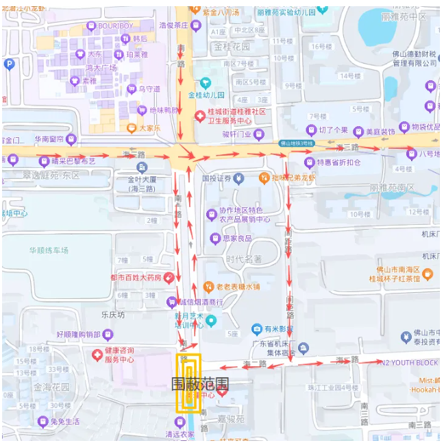 南一路与海二路交会路口围蔽施工。期间南一路由北往南向东转海二路方向暂停通车,车辆可通过海三路向南转入时代名著东侧小区间距路进入海二路。