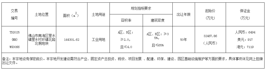 八、自本次公告起至网上挂牌截止期间,如有关于本宗地竞买文件的修改、澄清、说明等将通过网上交易系统以及佛山市南海区人民政府网发布,请有意参与竞买者密切留意。其它未尽事宜,详见本宗地的网上挂牌出让文件。