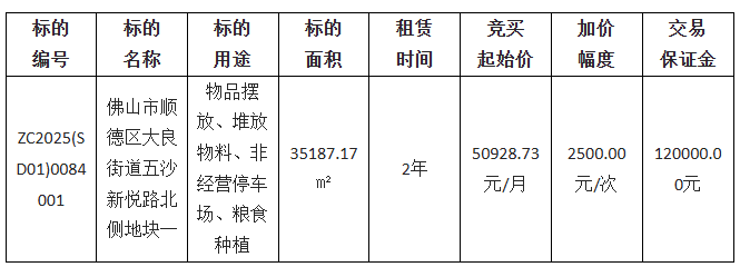 佛山市顺德区景良投资发展有限公司采用网上竞价方式出租位于佛山市顺德区大良街道五沙新悦路北侧地块一,欢迎符合资格的竞买人参与竞价。