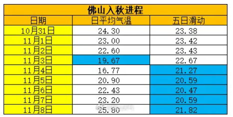 11月9日,佛山市气象台发布消息:佛山11月4-8日5天的滑动平均气温均低于22℃ ,其中11月3日为第一个日平均气温低于22℃的日期,所以今年佛山入秋日为11月3日,早于常年入秋时间(11月10日),为2015年以来入秋第4早的年份。今年自3月23日入夏以来,截至入秋日前一天(11月2日),佛山2025年的夏天为225天。