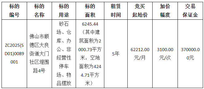 佛山市顺德区景良投资发展有限公司采用网上竞价方式出租位于佛山市顺德区大良街道大门社区堤围路4号,欢迎符合资格的竞买人参与竞价。