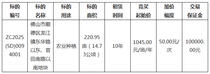 代理机构(佛山顺之易项目管理有限公司)受出租方(佛山市顺德区土地储备发展中心)委托采用网上竞价方式出租位于龙江镇东华路以东、官田南路以南地块使用权,欢迎符合资格的竞买人参与竞价。